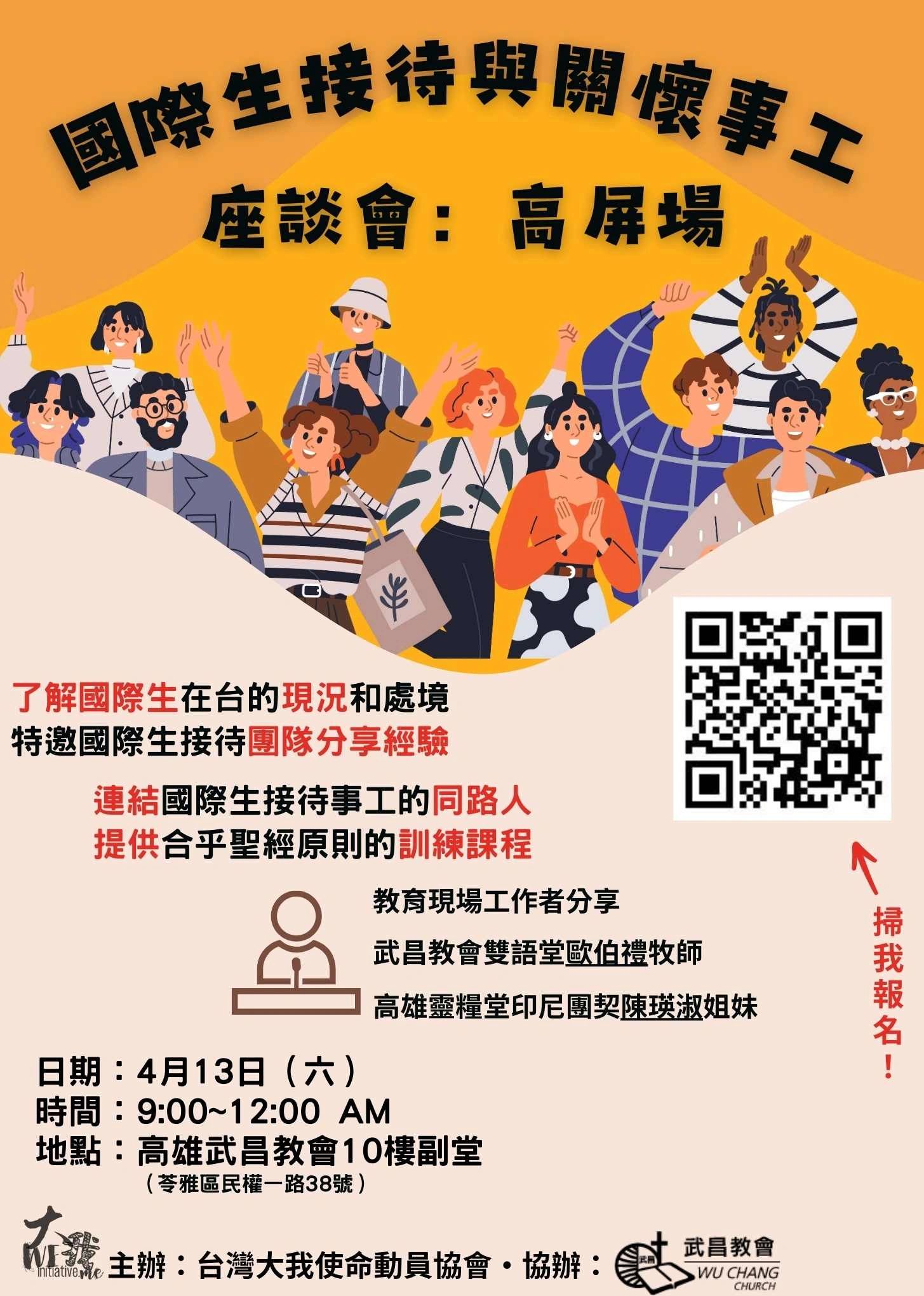 讓我們一起,用主的愛和合乎聖經原則的方式,接待和援護,已經來到家門前的萬族吧!首場國際生接待和援護事工座談會,將在高雄登場!