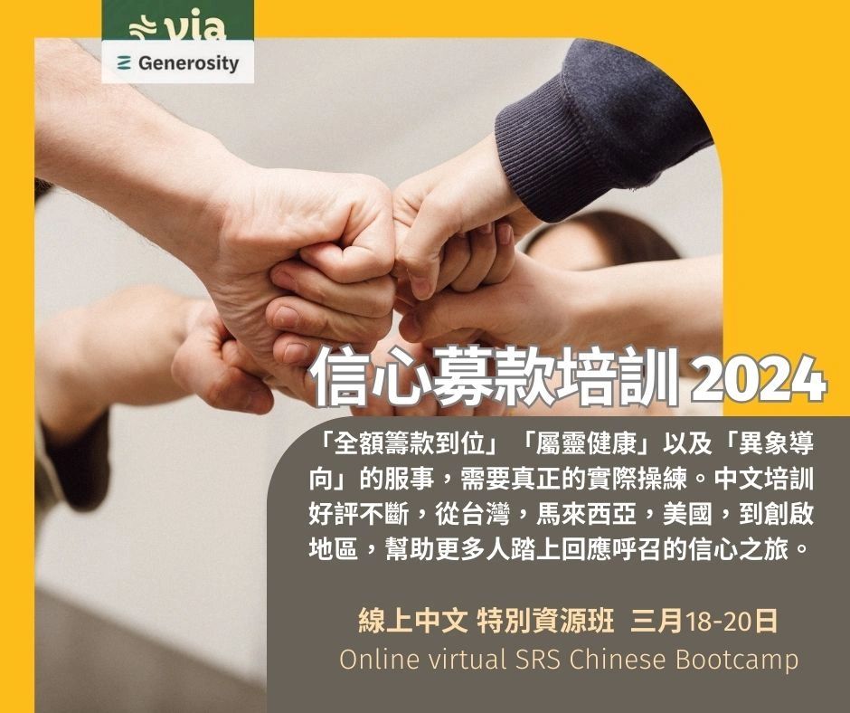 由北美最具影響力的培訓機構SRS( 2023年改名 Via generosity ),所設計的Bootcamp籌款培訓營。過去十幾年來,在美國協助來自超過五百個機構,成千上萬的宣教士與全職工作者,能「全額籌款到位」「屬靈健康」以及「異象導向」的服事。